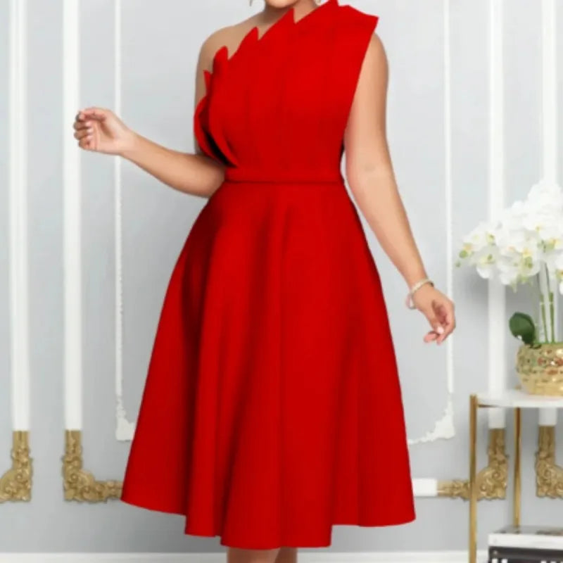 Chic One Shoulder Pleated Sleeveless Solid A-line Dress High Waist Evening Party Strapless Dress Women Summer
