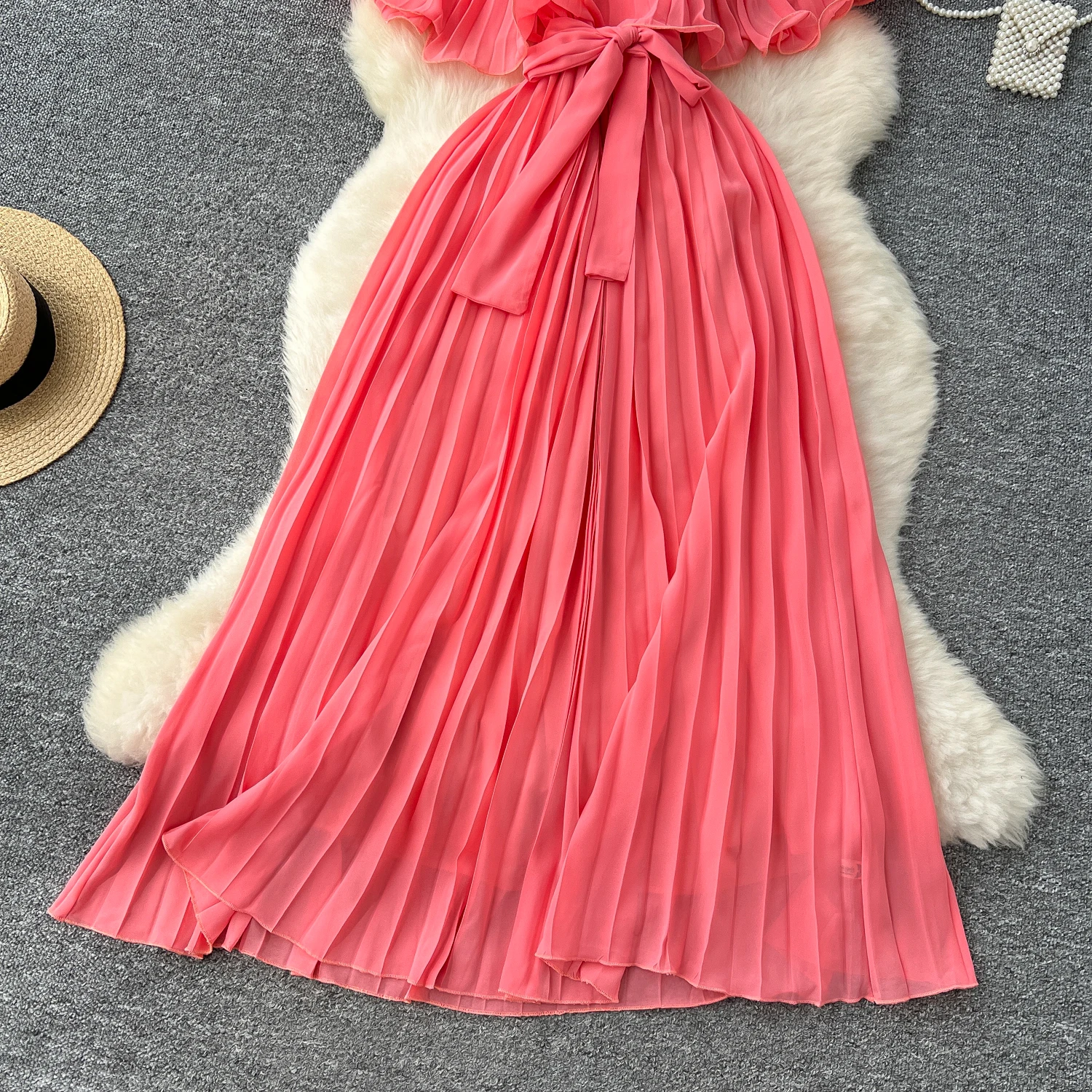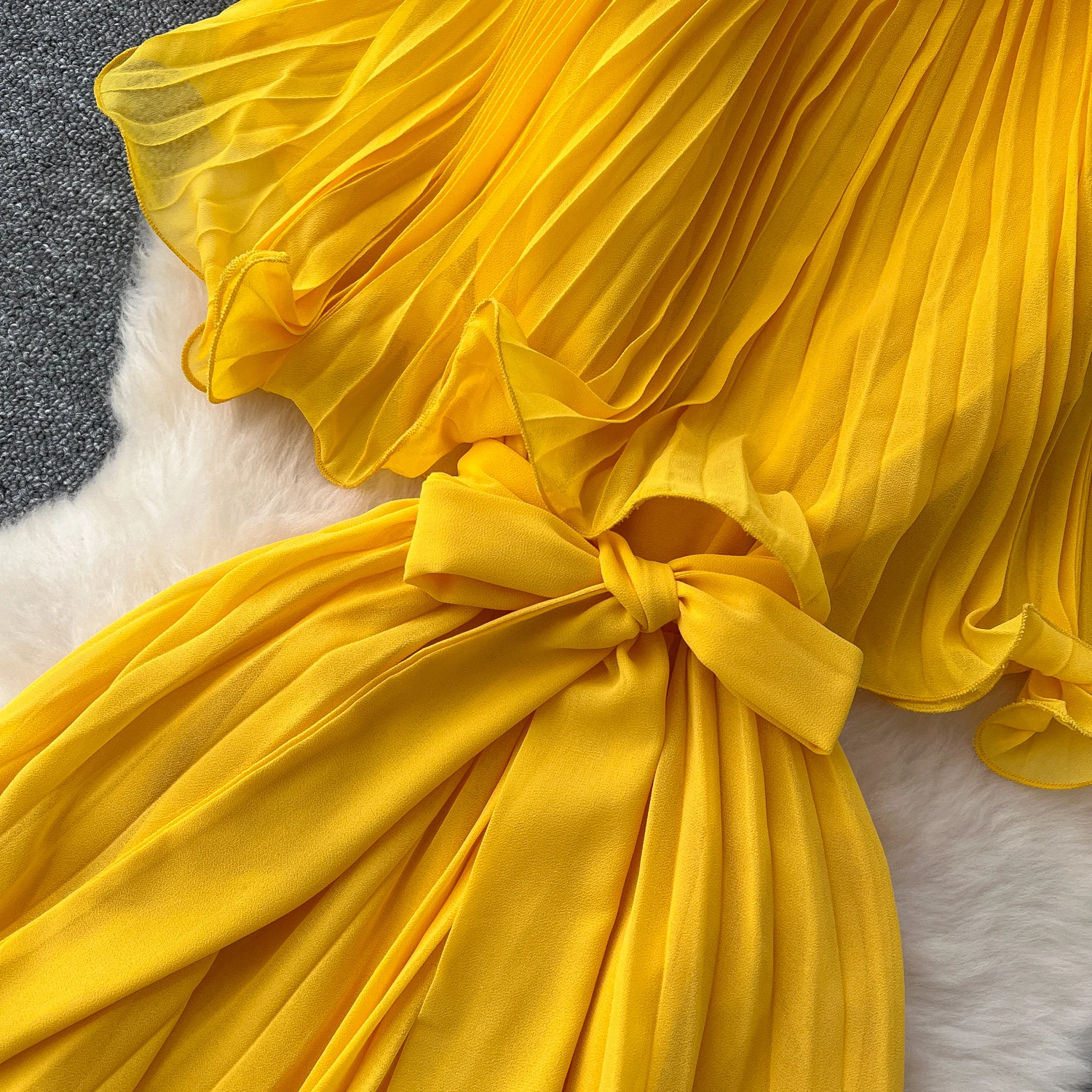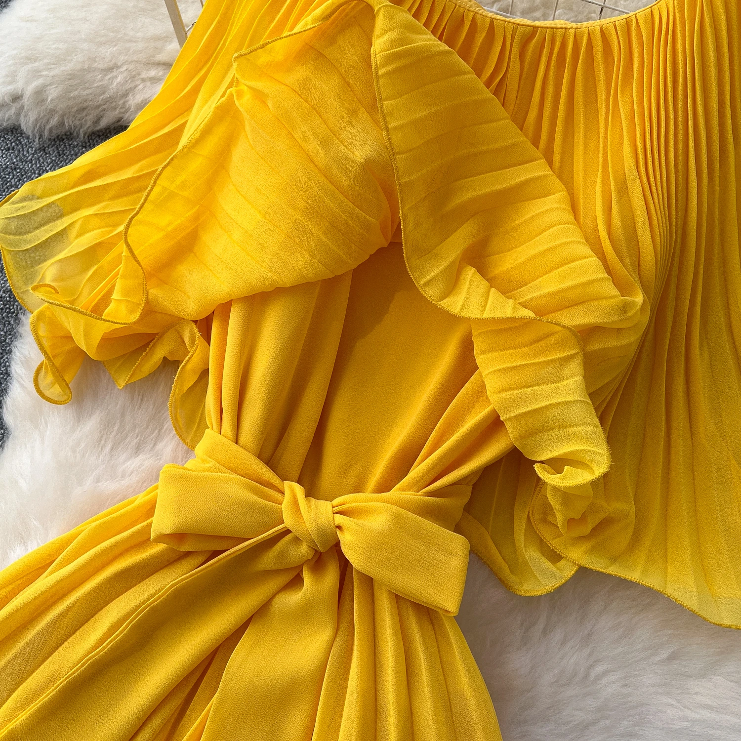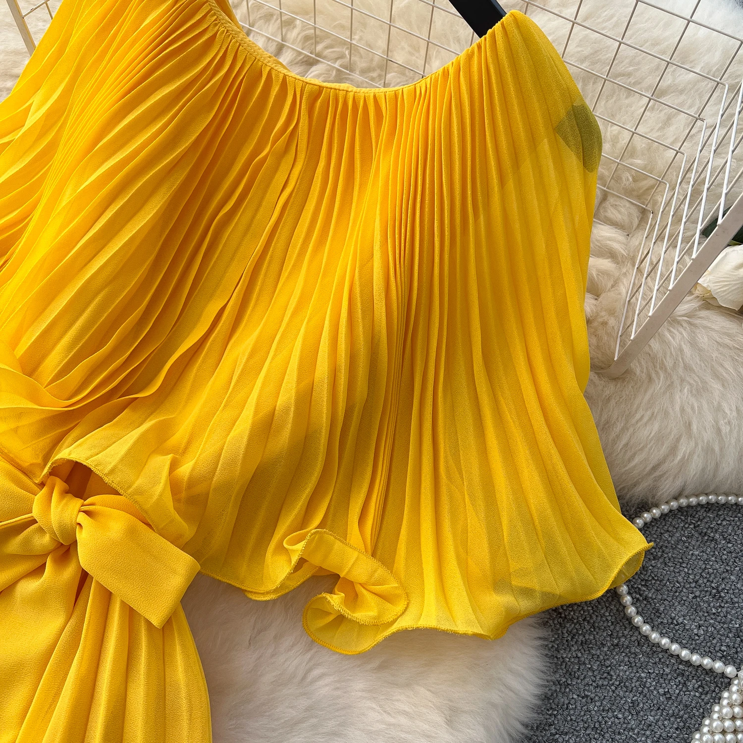 Chiffon Long Dress Short Sleeves Lace Up Slim Pleated Maxi Dress