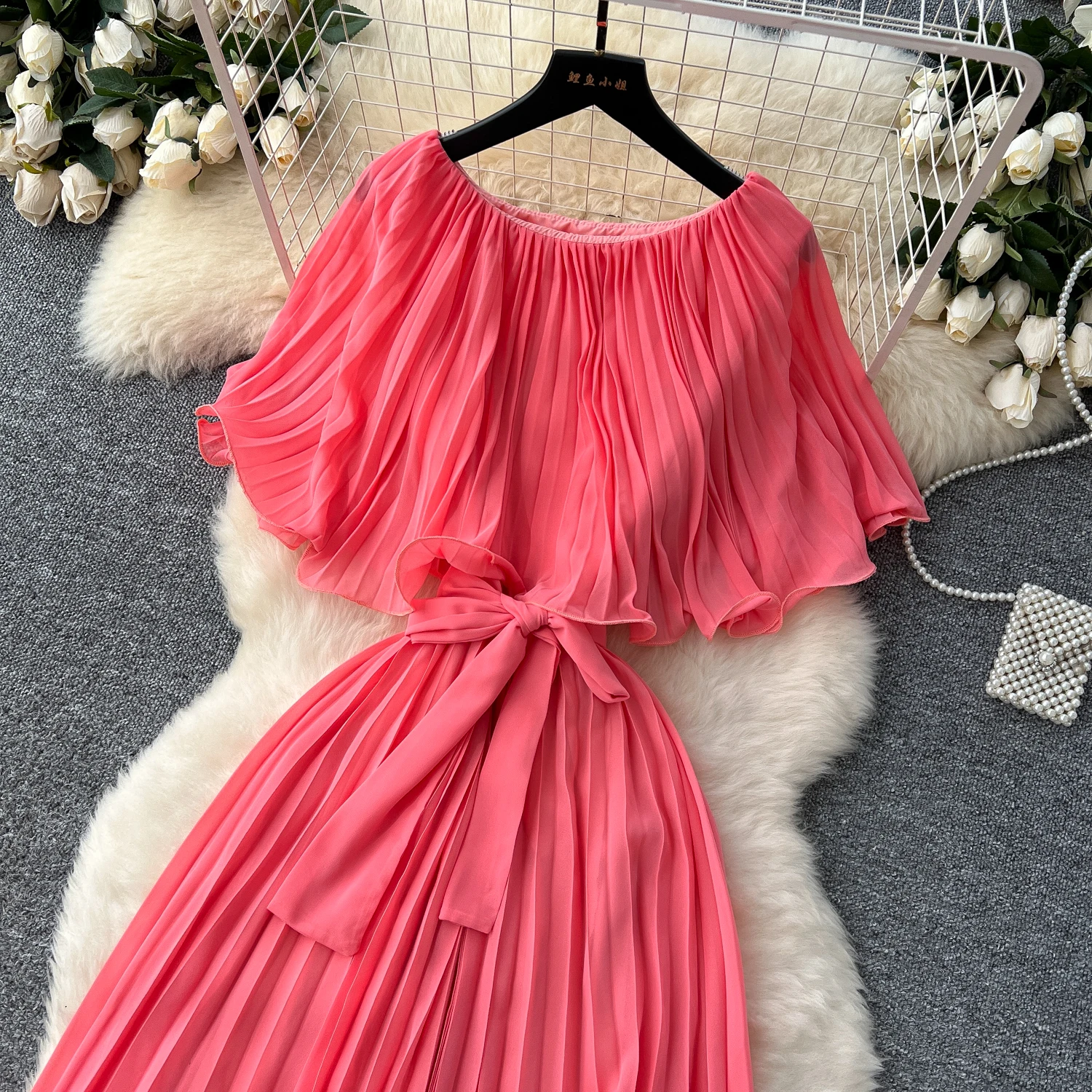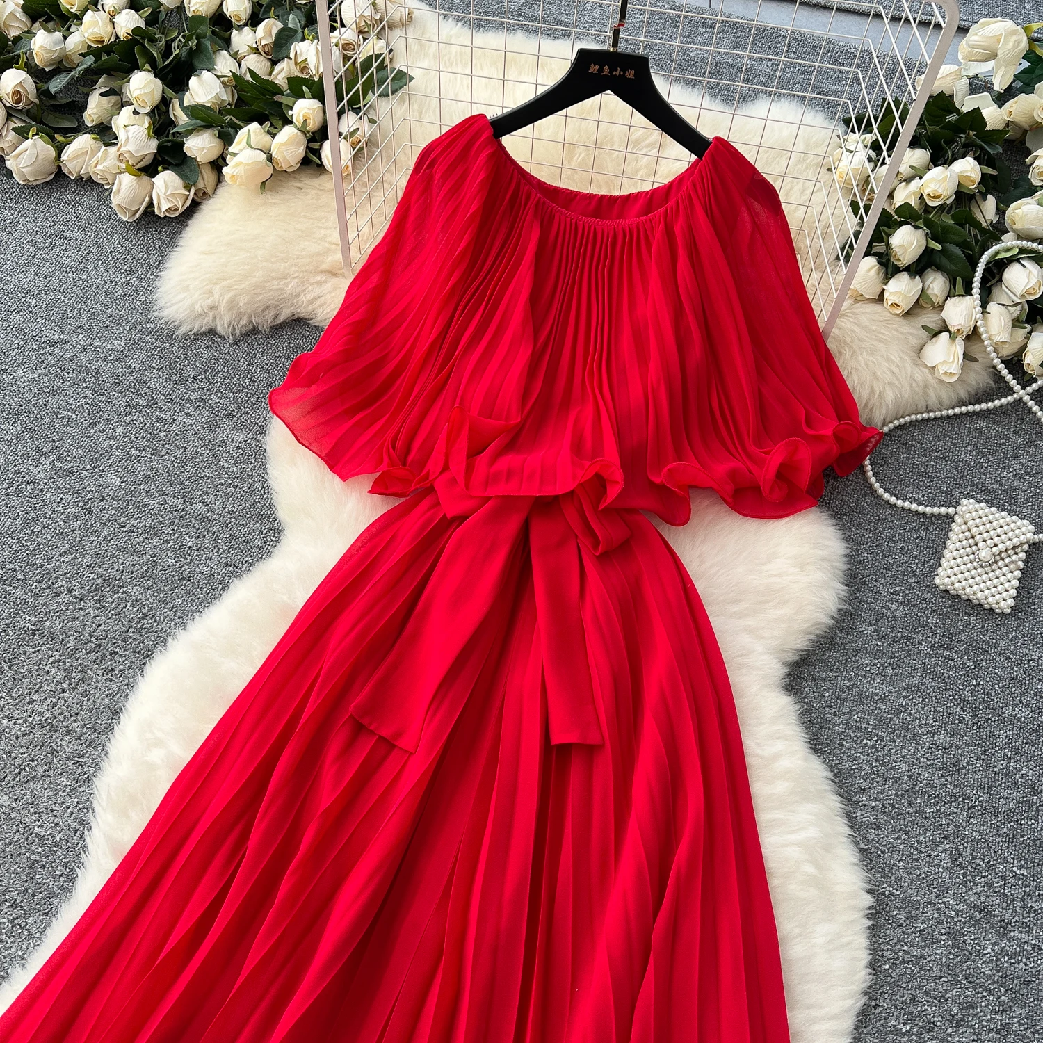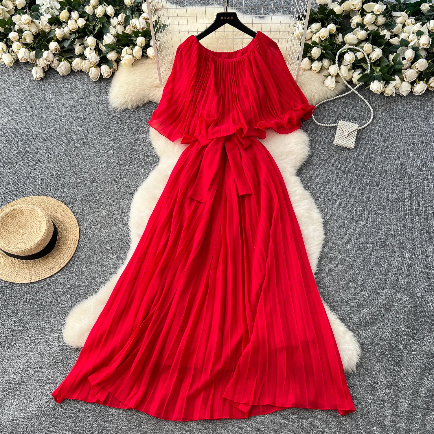 Chiffon Long Dress Short Sleeves Lace Up Slim Pleated Maxi Dress