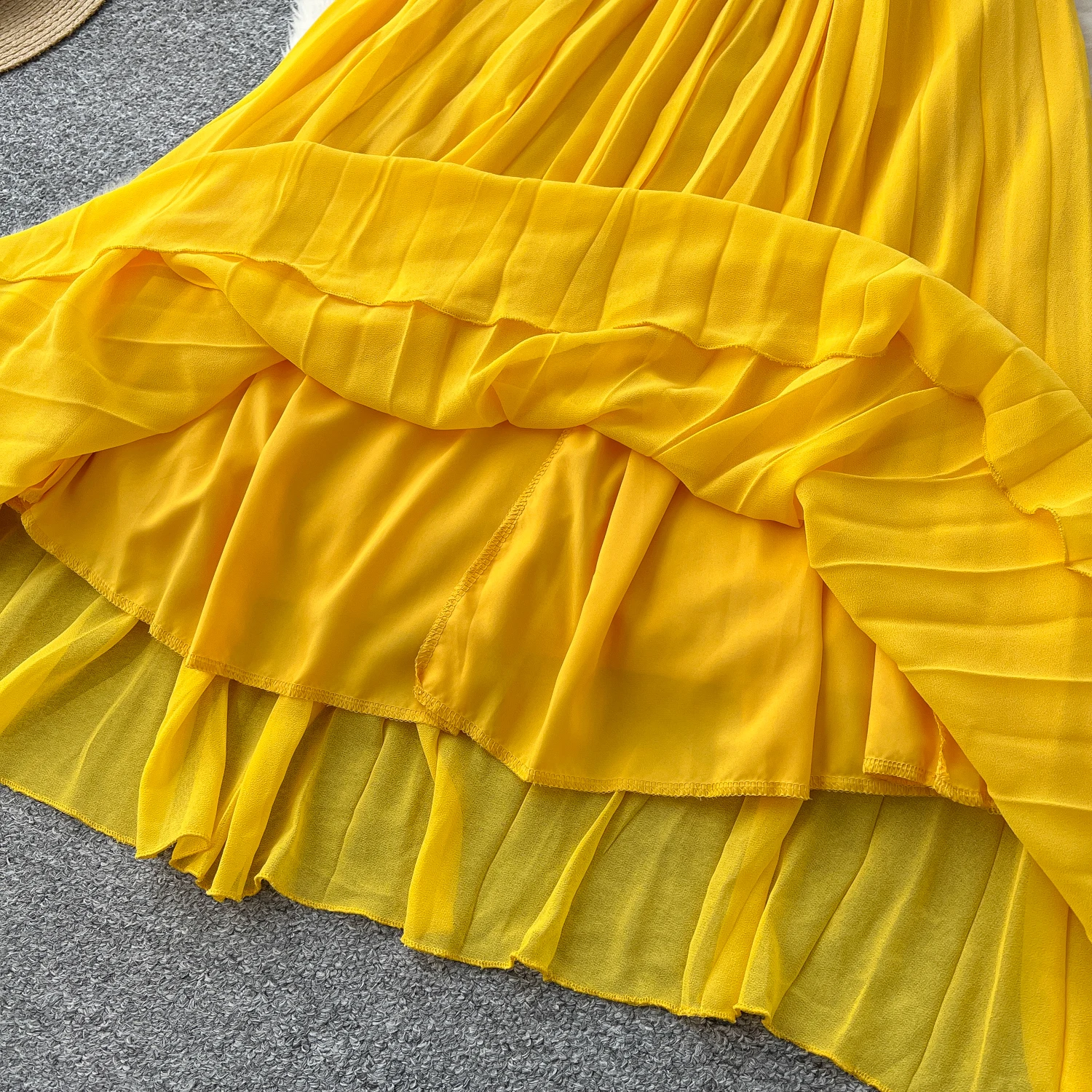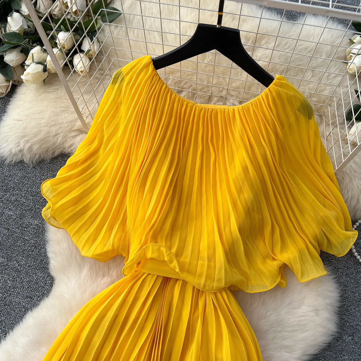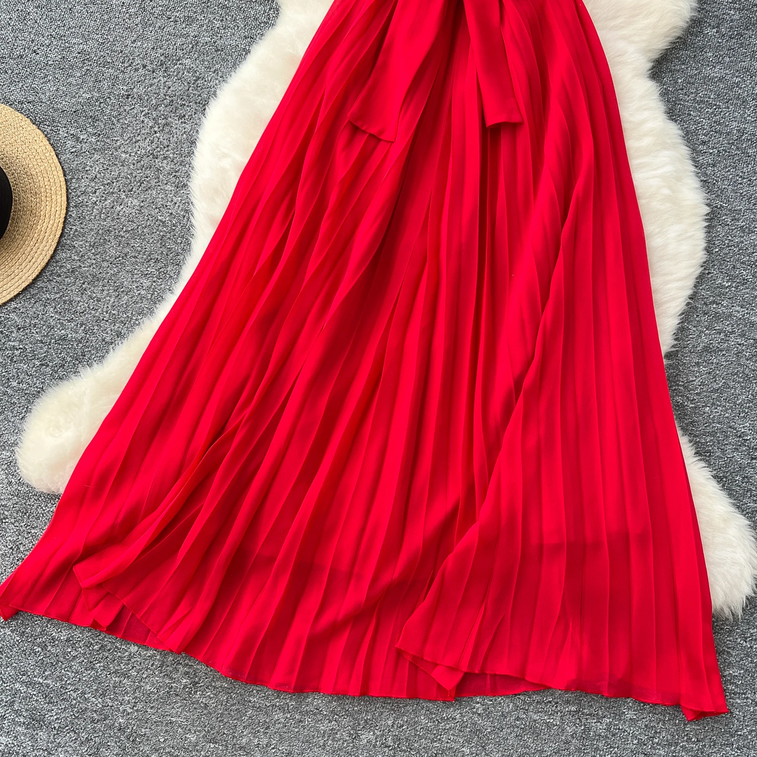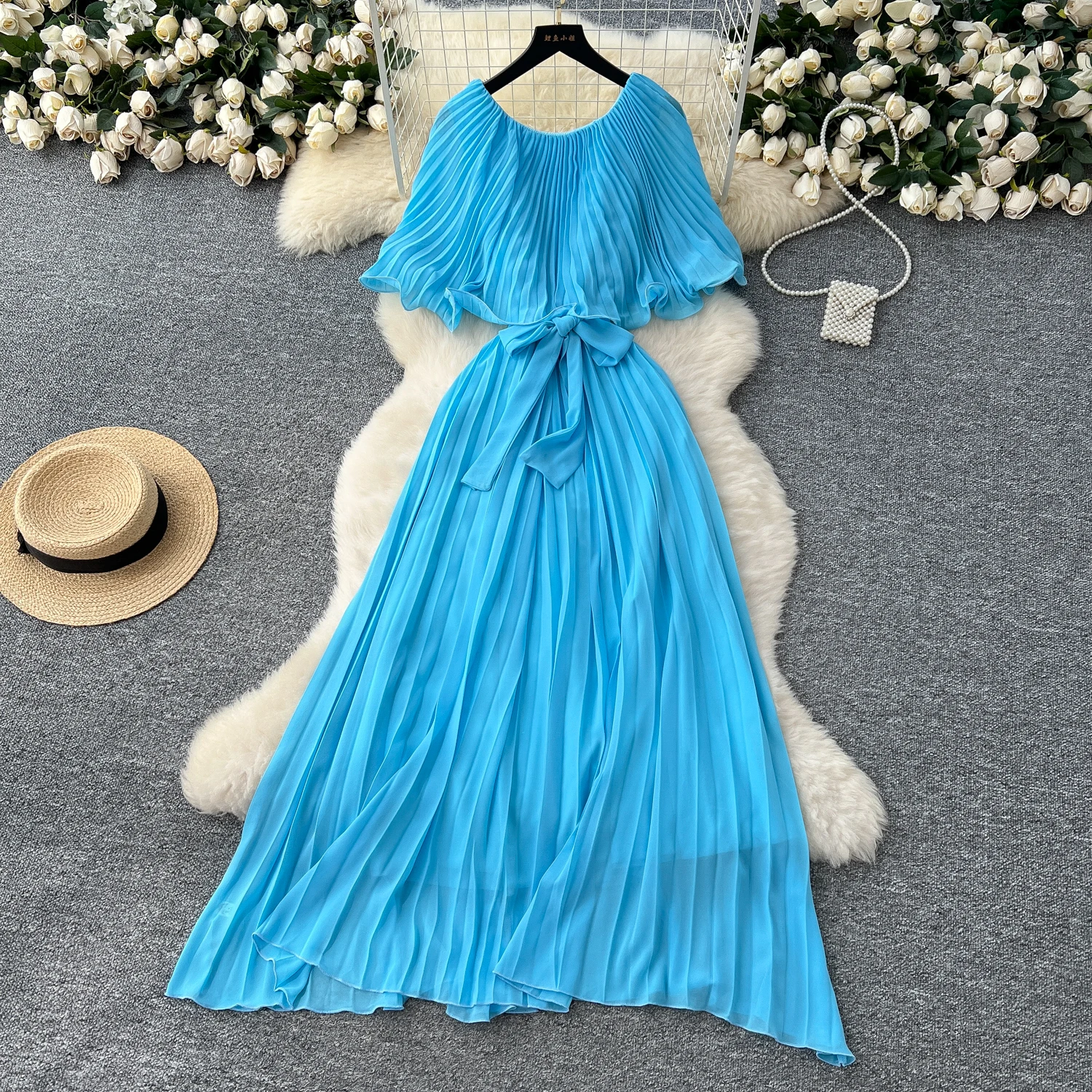 Chiffon Long Dress Short Sleeves Lace Up Slim Pleated Maxi Dress