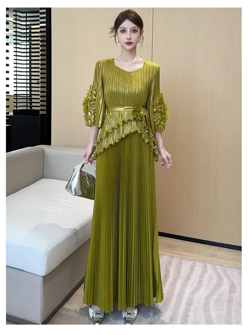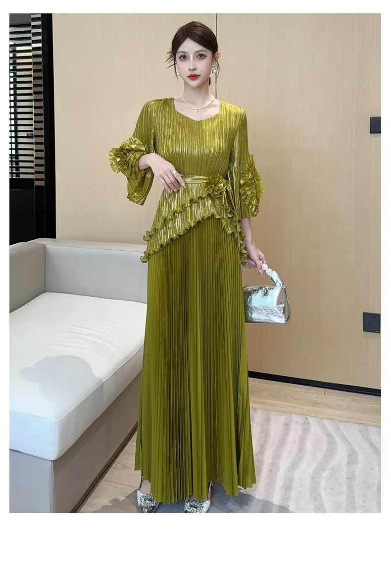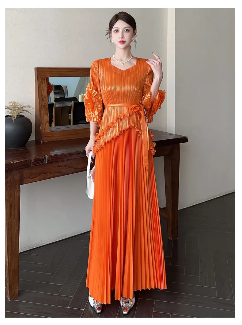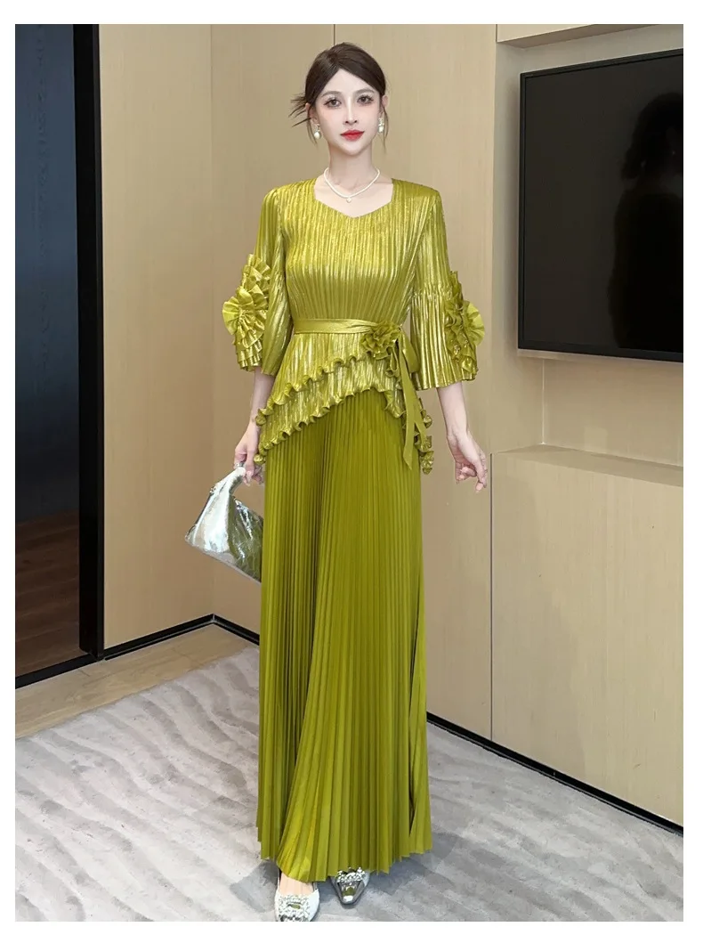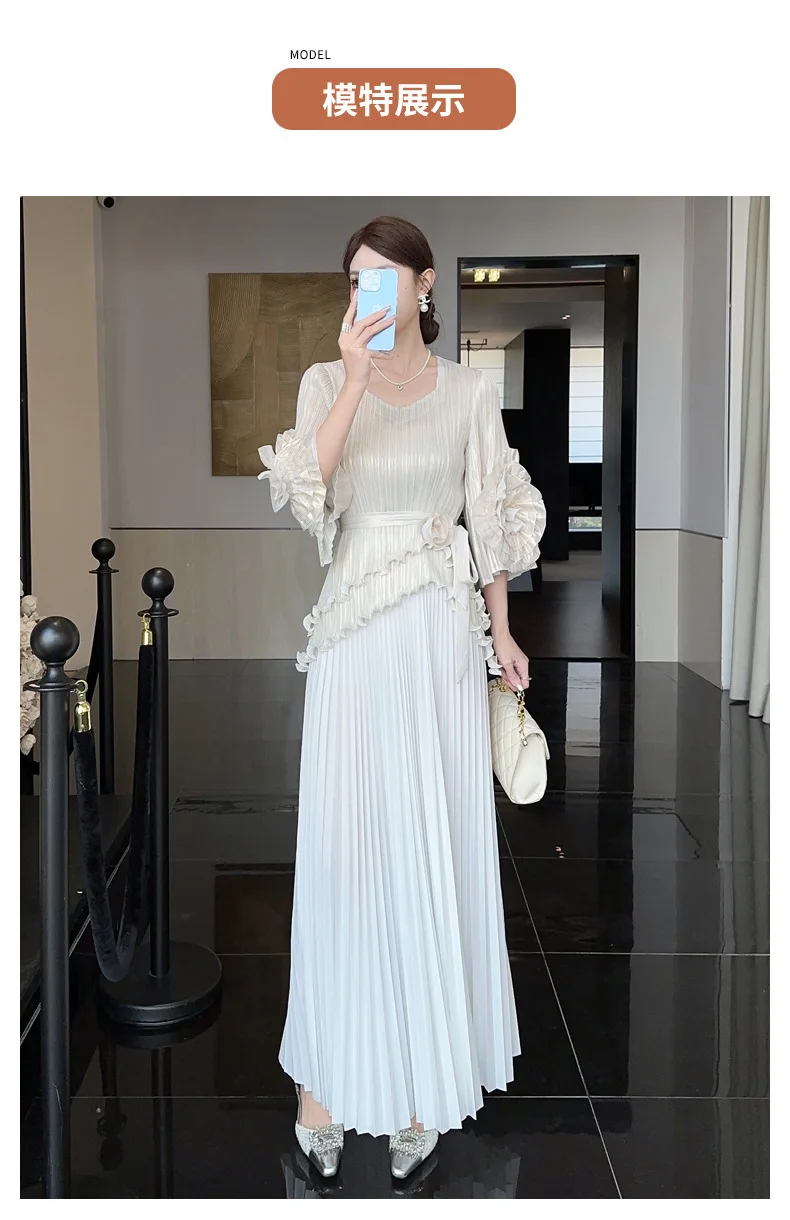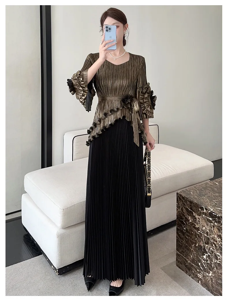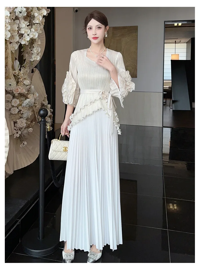 Free Size Pleated Women's Suit Irregular Top + High Waist Long Half Skirt Two-piece Set