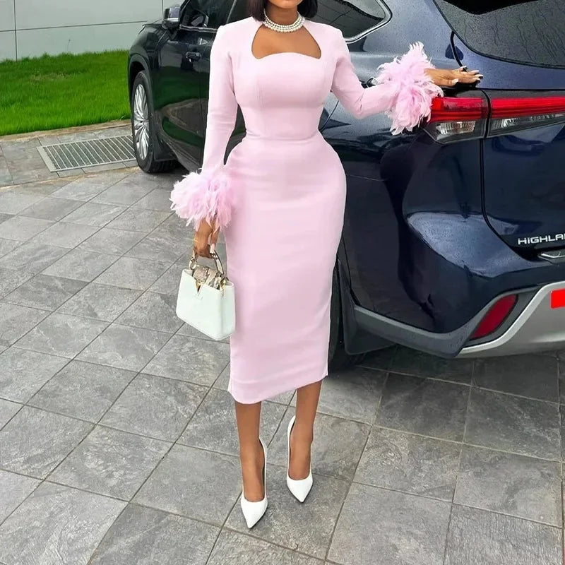 High Waisted Long Sleeve Feather Trim Split Bandage Dress