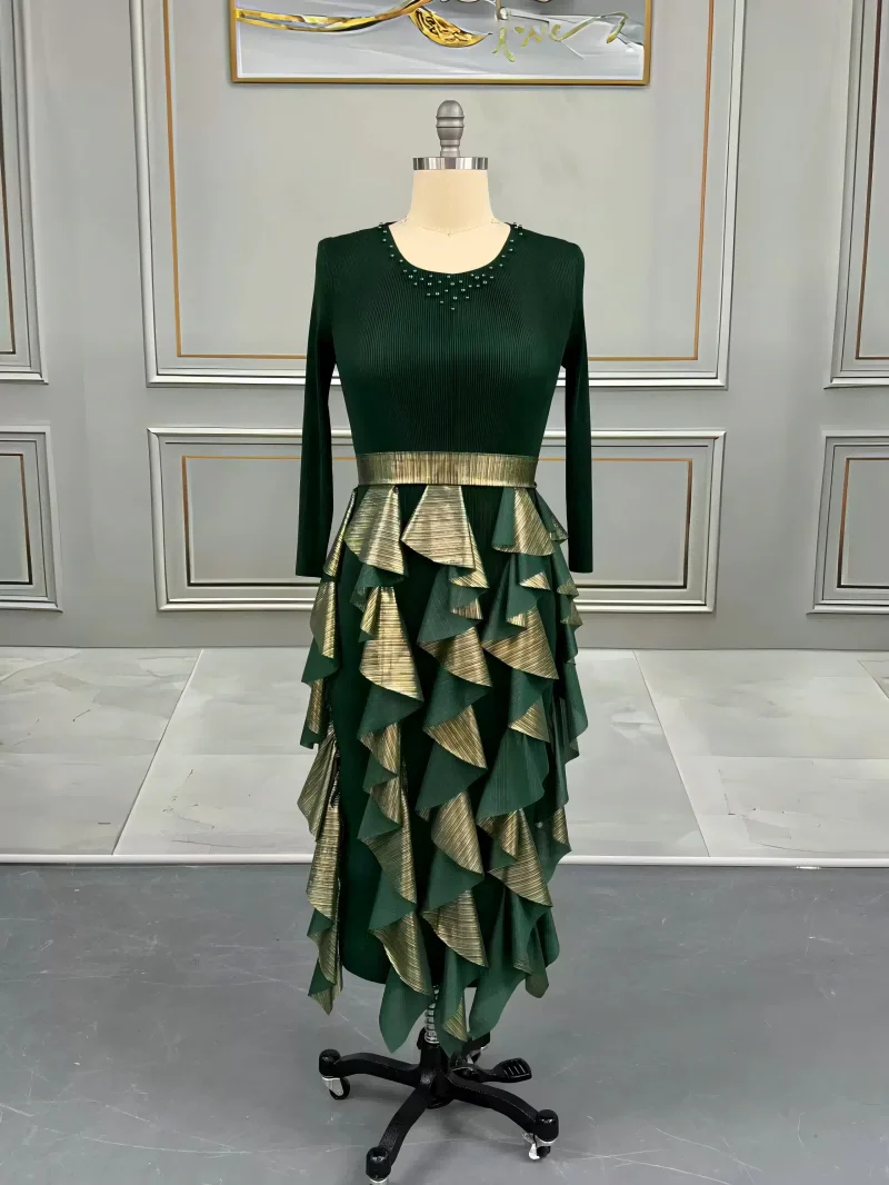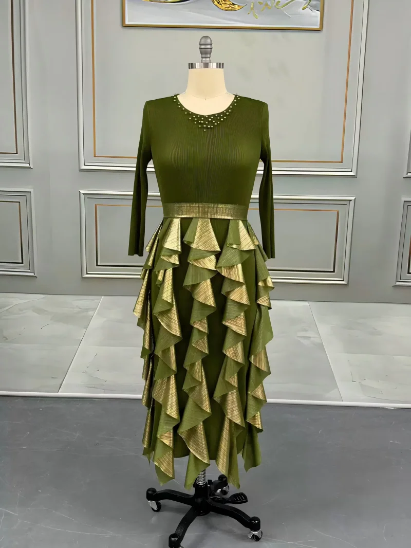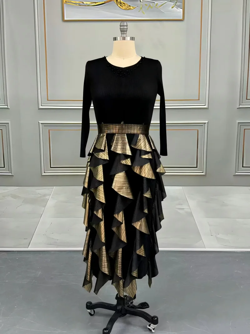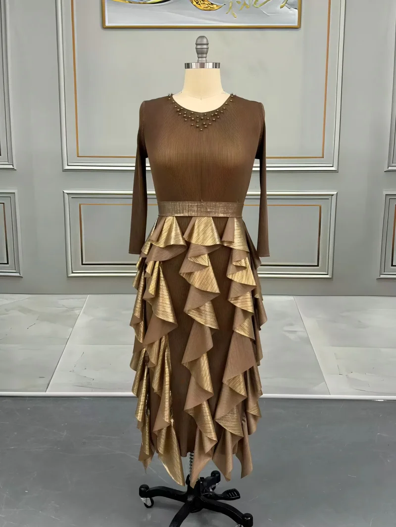Pleated Bronzing Splicing Dress Beaded Round Neck Loose Women's Dresses