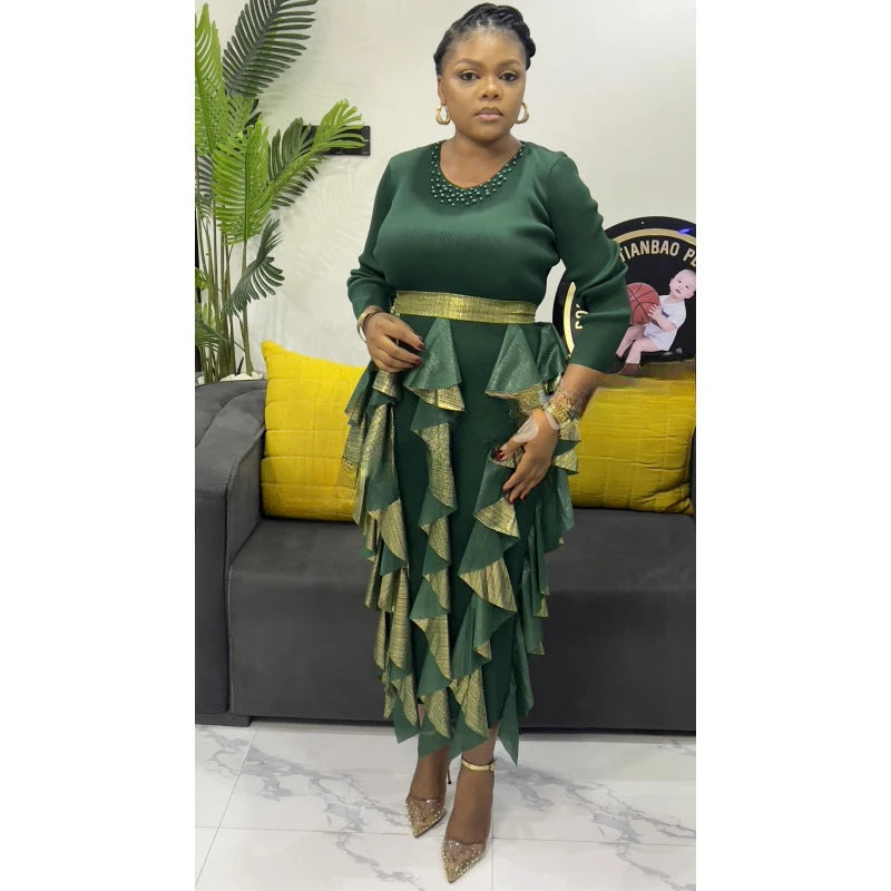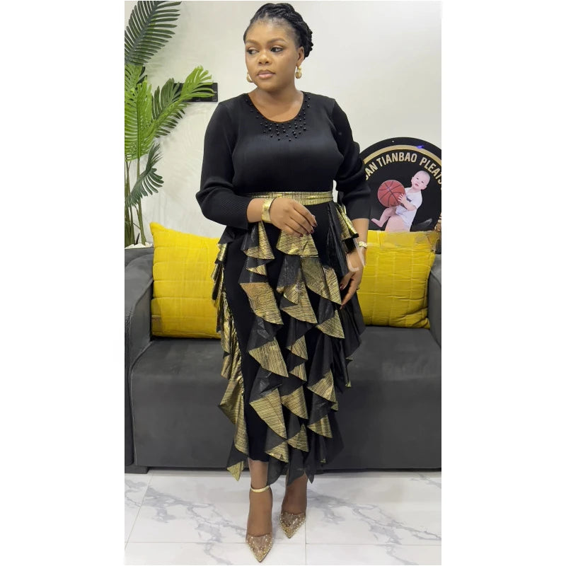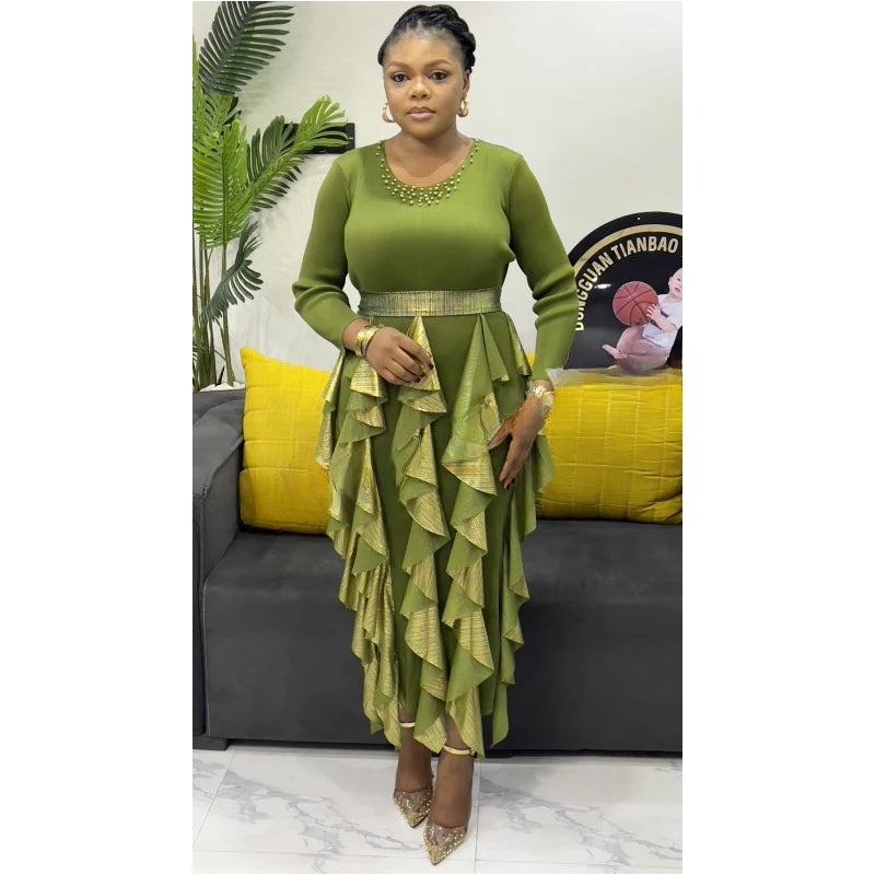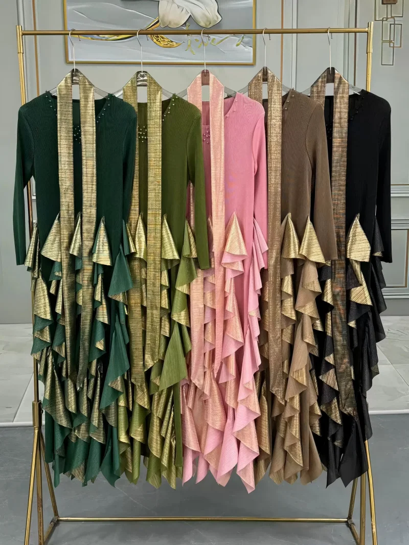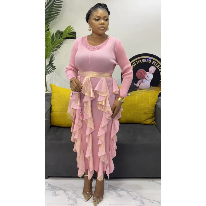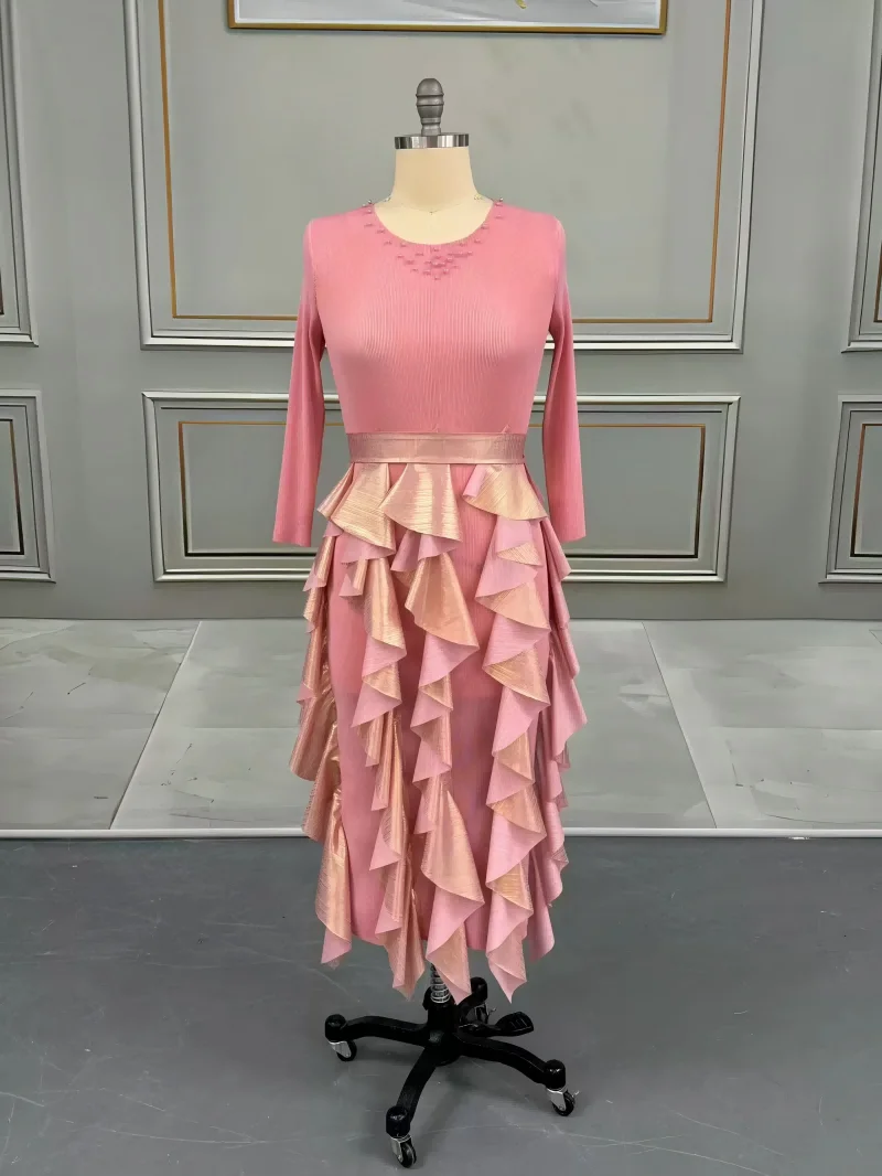 Pleated Bronzing Splicing Dress Beaded Round Neck Loose Women's Dresses