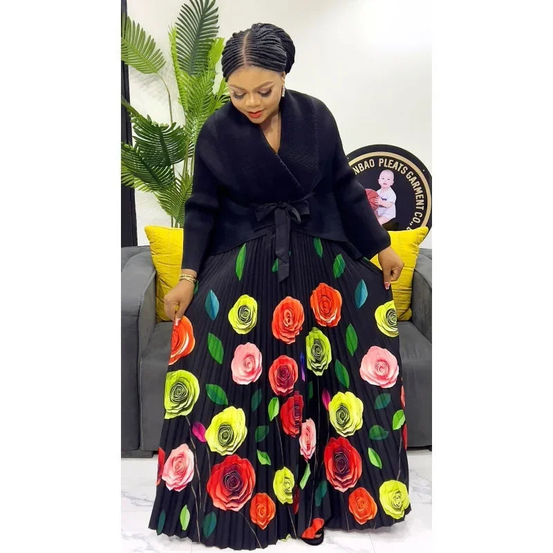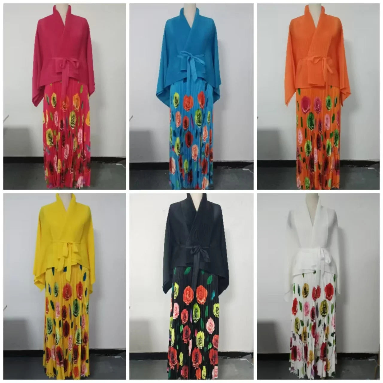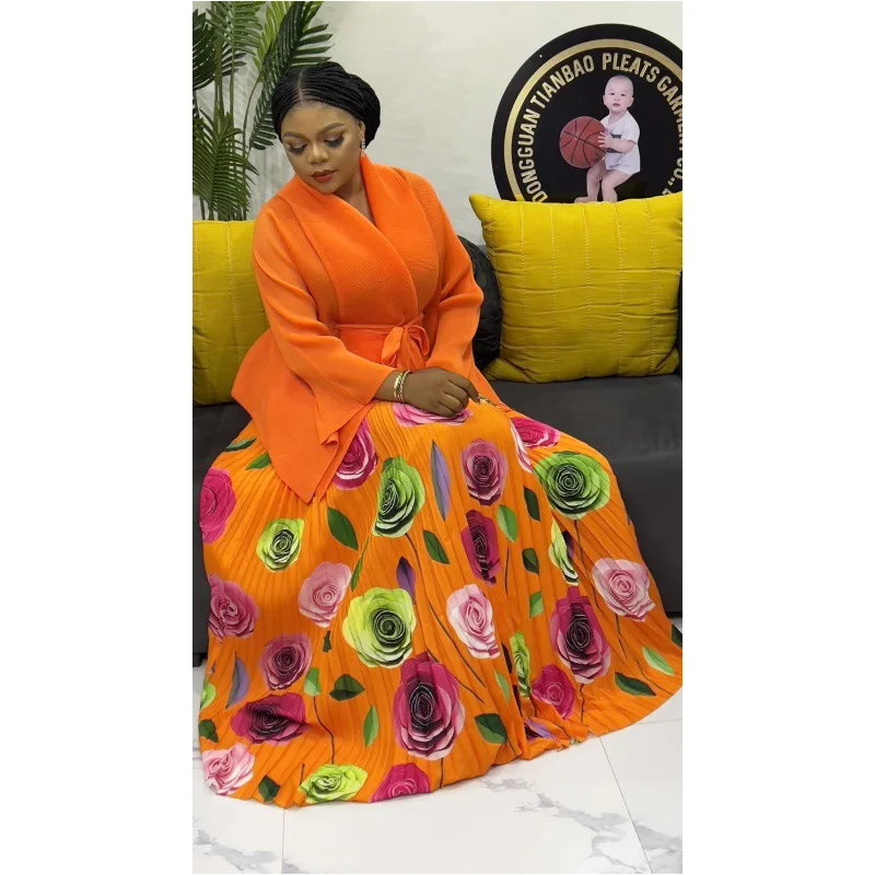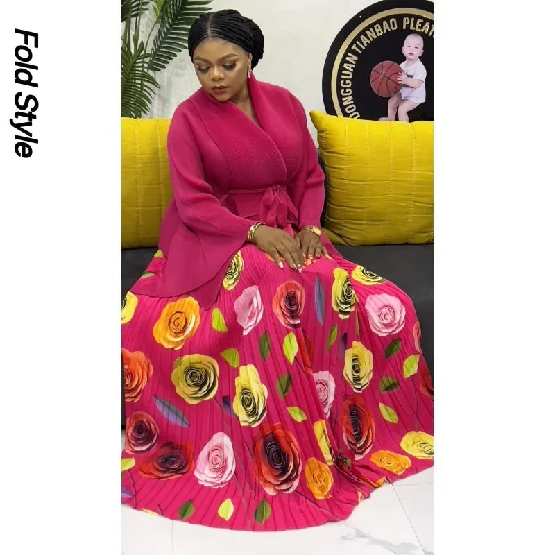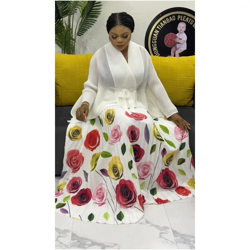 Pleated Ladies Long-sleeved Lace-up Solid Color Top Printed Swing Skirt Two-piece Set Women