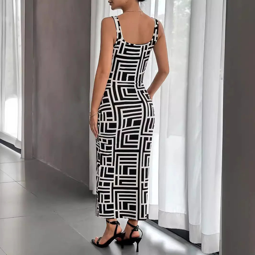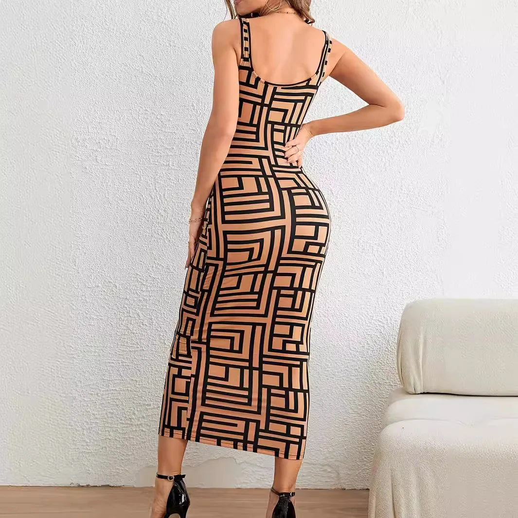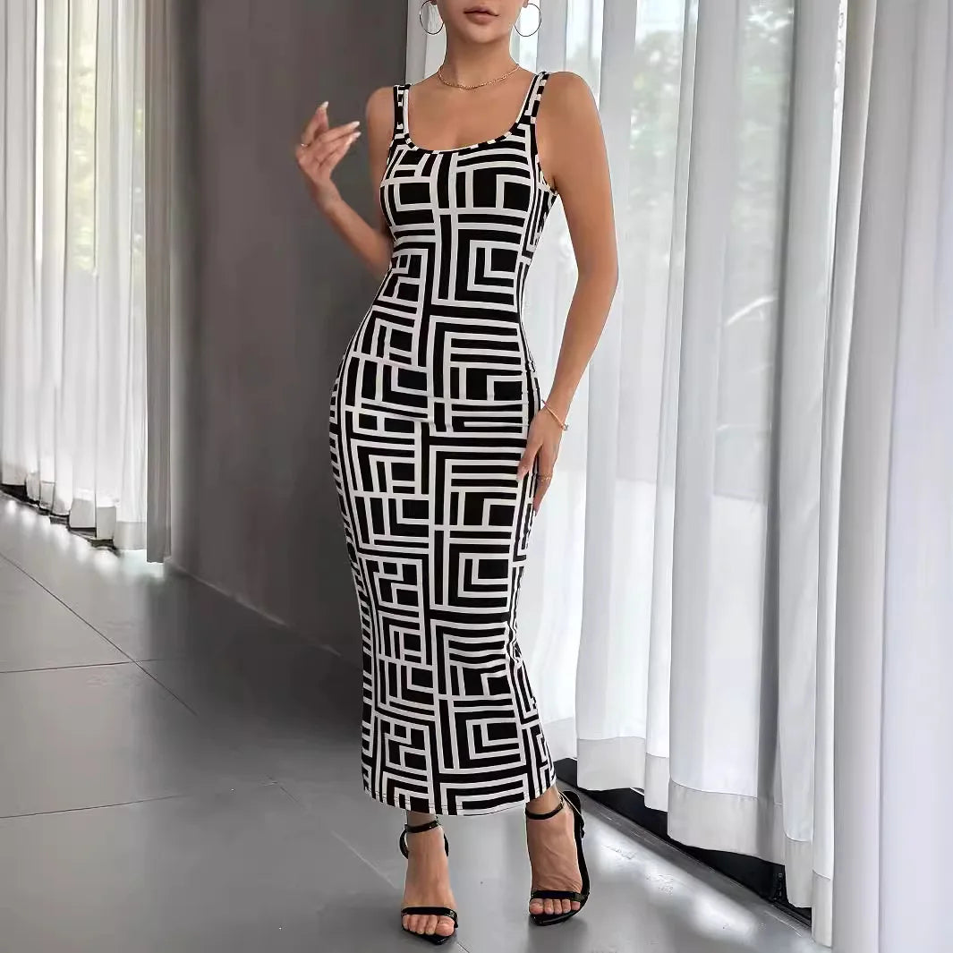 Womens Print Dresses Sleeveless Casual Round Neck Midi Skinny Dress